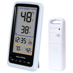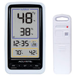 Know what you're heading into before you go out with the AcuRite® Digital Thermometer with Indoor/Outdoor Temperature and Humidity Monitors. Place the included outdoor sensor outside within 165' of the indoor display to get live readings of the temperatures and humidity levels for both environments simultaneously. The wireless thermometer's easy-to-read LCD screen shows the temperatures in either Fahrenheit or Celsius, upward/downward trends, the time, and the date. Keep track of daily high and low records for your own records. Get regular updates with the indoor thermometer's 60-second refresh rate and the outdoor sensor's 30-second refresh rate. The outdoor sensor can read temperatures from -40°–158°F. The indoor thermometer measures temperatures from 32°–122°F. The thermometer can track relative humidity levels from 1%–99%. Display the indoor thermometer on a tabletop with its extendable kickstand. The sensor has an integrated hanger. The main display requires 3 AAA batteries (not included) and the remote sensor requires 2 AA batteries (not included). Change the batteries when the low-battery indicator light switches on. Mfrs. 1-year limited warranty. Imported.