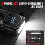 The Dyeetic Jump Starter with Air Compressor offers a comprehensive solution for vehicle emergencies and outdoor needs. Powered by a robust 3500A peak current lithium-ion battery, it can jump-start vehicles with engines up to 10 liters gasoline or 8 liters diesel capacity in seconds, supporting over 50 starts per full charge. The built-in 150PSI tire inflator adds versatility by enabling quick tire inflation, while the tri-mode LED flashlight provides essential lighting options including flash, strobe, and SOS signals for emergency situations or nighttime use. Featuring dual output ports, including a fast-charging port, it efficiently charges mobile devices at speeds exceeding 75%, making it a reliable portable power bank. The LCD display offers clear information on battery level, output voltage, and charging status for user-friendly operation. Designed with ten intelligent safety protections and real-time monitoring, it ensures safe use in extreme temperatures ranging from -4°F to 140°F and maintains up to 24 months of standby time. Its compact size and lightweight build (2.8 lbs) combined with a convenient carrying case make it easy to store and transport, providing dependable support for drivers and adventurers alike.