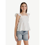 The Justice Girls Babydoll Top is a stylish and comfortable summer essential designed for girls sizes XS to XLP. Crafted from 100% cotton, this top features charming ruffle straps, delicate eyelet details, and light shirring on the bodice for a flattering fit. Its flowy silhouette ensures ease of movement and breathability, making it perfect for school days or casual outings. The pull-on closure adds convenience, while the sleeveless design keeps her cool during warm weather. This versatile top pairs effortlessly with various bottoms for a trendy look that embraces summer fun.