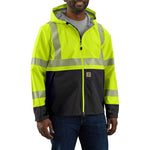 The Carhartt High-Visibility Storm Defender Loose-Fit Lightweight Class 3 Jacket for Men delivers heavy-duty safety and performance that won't weigh you down. It meets ANSI/ISEA 107 standards and ANSI Class 3, Type R visibility standards, which makes it a great choice for many jobsites. Plus, reflective tape enhances visibility even more and is effective through 75 home launderings. Waterproof yet breathable Storm Defender technology, fully taped seams, and waterproof front zipper lock out moisture to keep you bone dry and comfortable. Also features an attached hood with adjustable drawcord, 2 interior drop-in pockets, 2 zippered hand pockets, hook-and-loop adjustable cuffs, and a drop-tail hem. This hi-vis jacket is made of 5.25-oz., 100% polyester 3-layer twill. Center Back Length (Based on Size M): 30.5". Machine wash. Imported.