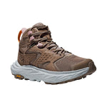 A lightweight, durable, and eco-friendly waterproof hiker for women, HOKA Anacapa 2 Mid GTX Waterproof Hiking Boots for Ladies offers reliable comfort and support on the trail. Made of recycled polyester mesh and Leather Working Group gold-rated waterproof nubuck leather and featuring an Achilles heel comfort design and abrasion-resistant rubber toe cap, this mid-height hiking boot's upper protects and supports your feet and ankles over any hike. Featuring a 71% recycled polyester face fabric, the GORE-TEX waterproof/breathable membrane system inside this protective upper keep feet dry and comfortable. Built around HOKA's signature high-stack, compression-molded EVA midsoles made with 30% sugar cane and enhanced with extended SwallowTail heel geometry, the Anacapa 2 Mid GTX delivers a smooth ride on the trails everytime. Molded polyurethane sockliners made with 50% soybean oil add additional cushioning beneath your feet. This advanced foot platform provides a symmetrical bed of cushion without additional prescriptive technologies while maintaining a responsive toe-off for when you want to go faster. Vibram Megagrip rubber outsoles feature deep lugs to power over trails, no matter how rough or loose the trail. 7mm drop. ith superior cushioning for women
