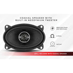 The DS18 ZXI-464 Elite 4x6 2-Way Coaxial Car Speakers are engineered to elevate your vehicle's audio performance with exceptional clarity and volume. These speakers feature a durable Kevlar cone combined with a glass fiber cone design that enhances sensitivity and sound output even at lower power levels. The 2-way coaxial design ensures a comprehensive frequency response from deep lows to crisp highs, covering 80 Hz to 20 kHz. With a 4-ohm impedance and a maximum power handling of 180 watts (60 watts RMS), these speakers deliver robust sound suitable for mid-tier audio enthusiasts seeking quality and loudness. The speakers include a 1-inch voice coil diameter, rubber surround, steel basket, and barium ferrite magnet for reliable performance. The tweeter uses a PEI diaphragm with a neodymium magnet to produce clear high frequencies. Installation is straightforward with included mounting hardware, and the speakers fit universal car models with front mount baffle cutouts measuring 3.46 inches by 5.51 inches and an overall depth of 2.8 inches. Upgrade your car audio system with these high-performance coaxial speakers designed for an immersive surround sound experience.