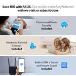 The ASUS RT-AXE7800 Tri-band WiFi 6E Router sets a new standard in wireless networking by integrating cutting-edge WiFi 6E technology that introduces a dedicated 6 GHz band, significantly increasing network capacity and reducing interference. This router delivers combined wireless speeds up to 7800 Mbps, providing ultra-fast performance for demanding applications such as high-definition streaming, online gaming, and large file transfers. It features ASUS Safe Browsing to protect users from undesirable content and offers advanced parental controls that allow flexible customization to safeguard children’s online activities. Security is further enhanced with AiProtection Pro powered by Trend Micro, offering commercial-grade protection against cyber threats, while the Instant Guard feature enables secure VPN access when away from home. The router supports AiMesh technology, allowing users to expand their network seamlessly by connecting compatible ASUS routers for whole-home WiFi coverage. With multiple RJ-45 ports including a high-speed 2.5G port, it provides versatile wired connectivity options for various devices. Compatible with Windows, Mac OS, Linux, and mobile apps, this router is designed to meet the needs of home users, gamers, and businesses seeking reliable and secure internet access.