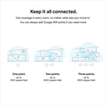 Google Wifi gives you whole home coverage; 1 Pack covers up to 1500 square feet and 3 Pack covers up to 4500 square feet; points work together to create a mesh network for more coverage