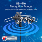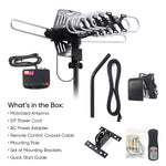 Experience high-quality live TV broadcasts with the onn Outdoor TV Antenna featuring an extensive reception range of up to 85 miles. This multidirectional antenna is designed to capture free over-the-air Ultra-HD, Full HD, and HD signals from local networks, eliminating the need for cable subscriptions. Its 360-degree rotating mounting pole allows flexible positioning to maximize signal strength in various outdoor environments. The antenna operates across VHF (47MHz-230MHz) and UHF (470MHz-608MHz) frequency bands with gain levels of 22±2dB for VHF and 23±2dB for UHF, ensuring clear reception. A built-in 3G/4G/LTE filter reduces interference from mobile signals for enhanced picture quality. The package includes a 5.9 ft power cord, AC power adapter, remote control, coaxial cable, mounting pole, mounting brackets, and a quick start guide for straightforward setup. Ideal for those seeking reliable access to local broadcast channels with superior resolution and ease of installation.