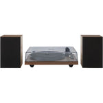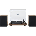 The Crosley C62 was designed to be a ready-to-go-sounds-damn-good-straight-out-of-the-box turntable system that doesn't break the bank. This fully manual two-speed (33 1/3 and 45 RPM) turntable sports an MDF plinth wrapped in a faux walnut veneer that would fool the best of Lumberjacks. The turntable base supports output through both RCA and speaker clips, which means you can pair this to your existing system as well. The built-in, switchable pre-amp makes hook-up to your receiver or other speakers a snap. The matching MDF speakers look just as good as the turntable and each rock a mid-range speaker and tweeter.