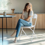 The edx 4-Pack Folding Chairs are crafted to deliver reliable and comfortable seating for a wide range of indoor environments including auditoriums, banquets, commercial spaces, and social gatherings. Constructed with a durable iron frame coated in white PVC, these chairs resist wear while maintaining a sleek modern appearance. The foam cushions on the seat and backrest provide ergonomic support for extended use, enhancing user comfort. The unique triangular reinforcement bars on both sides of the chair frame increase stability and strength, ensuring safe and steady seating. Designed with portability in mind, each chair weighs just 6.8 pounds and folds flat to save space when not in use. The stackable design further optimizes storage efficiency for venues with limited room. Non-slip leg protectors prevent floor scratches and pressure damage, preserving your flooring surfaces. These waterproof chairs are easy to clean and maintain, making them suitable for frequent use in busy settings such as weddings, conferences, cafeterias, and offices. With no assembly required and a robust maximum load capacity of 330 pounds per chair, this set offers convenience without compromising durability or style.
