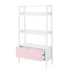 Build Your Own Furniture Kids Ladder Bookcase with Drawer, Pink/White The Build Your Own Furniture Kids Ladder Bookcase is a great solution to help your kids keep their space neat and organized. This bookshelf features three tiers of tapered shelving plus a spacious bottom drawer with a cutout handle. Sturdy and durable, the metal frame provides support while maintaining a modern, minimalist aesthetic. It is available in all white, white with a navy blue drawer front and white with a light pink drawer front. The versatility and simple, open design makes it ideal for kids, preteens and teens alike. Make tidying up fun and functional with the Build Your Own Furniture Kids Ladder Bookcase.