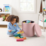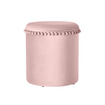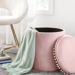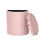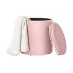 The Kvell Pom Pom Kids Storage Ottoman combines charming design with practical functionality, making it an ideal addition to any child's room or play area. Upholstered in plush blush velvet and accented with whimsical pom pom trim, this ottoman adds a touch of traditional decor style while serving multiple purposes. The round shape and lift-off lid reveal ample hidden storage space, perfect for stowing toys, books, or other essentials to maintain an organized environment. Crafted from sturdy MDF with foam filling, it supports seating up to 200 pounds comfortably, providing a cozy spot for children or adults alike. Its water-resistant exterior makes cleaning simple—just wipe with a damp cloth to keep it looking fresh. Delivered fully assembled, this ottoman is ready to use immediately, offering both convenience and style. Whether placed in a playroom or bedroom, it enhances the space by combining storage efficiency with comfortable seating and decorative appeal.