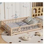 Triple Tree Montessori Full Floor Bed Frame for Toddlers with Wooden Fence and Slats, Natural This floor bed is a versatile and practical option for creating a safe and comfortable space for play and sleep. Constructed from premium pine and engineered wood, this bed is strong and durable, and the full surrounding fence ensures your child is well protected. The slatted platform bed provides sturdy support for the mattress and allows for easy play and sleep. With a thoughtfully designed swing door, you can easily manage movement in and out of bed.