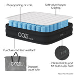The Cozi by Tzumi King Size Air Mattress is crafted to deliver superior comfort and convenience for all your sleeping needs, whether at home, camping, or traveling. Its soft flocked PVC surface offers a plush, velvety feel that enhances sleep quality. Equipped with a built-in pump, this inflatable bed inflates and deflates swiftly, eliminating the need for separate pumps and simplifying setup and storage. The mattress features 56 internal air coils that provide consistent support across the surface, minimizing sagging and ensuring a stable sleeping platform. With a thickness of 13 inches, it offers ample cushioning and comfort. The durable materials used in construction ensure long-lasting performance and reliability. Supporting up to 600 pounds, this air mattress accommodates a wide range of users comfortably. Additionally, it comes with a convenient storage travel tote and a repair kit to address any minor punctures or leaks during use. Its portable design makes it an excellent choice for indoor or outdoor activities such as camping or hosting guests at home.