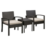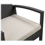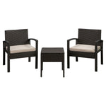 For year-round use, the Balkene Home Bern 3-Piece Conversation Set makes a classic choice for maintenance-free outdoor seating. Enjoy your time outdoors, relaxing with a friend on the patio or poolside, with this set of 2 lightweight, sturdy armchairs with fitted cushions (included) and occasional table. Features maintenance-free, all-weather wicker construction, and the rich mocha finish brings classic beauty to any outdoor living space. Chair (2): Max Wt. Cap.: 350 lbs.; 23"L x 23"W x 28"H; Weight: 15 lbs. Table: 19"L x 19"W x 14"H' Weight: 4 lbs. Imported.