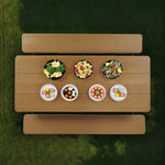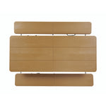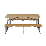 The Living and More 3-Piece Picnic Table Set combines functionality and durability in a stylish design suitable for both indoor and outdoor settings. The set includes a 6-foot rectangular folding table and two matching benches, each crafted with a high-density polyethylene (HDPE) surface that resists stains and simplifies cleaning. The powder-coated steel frame ensures long-lasting rust resistance, while the wood-grain finish adds a traditional aesthetic appeal. Each bench features an additional center support leg to enhance stability, supporting up to 600 lbs. distributed weight per bench, while the table supports up to 350 lbs., comfortably seating up to six adults. The telescopic extension legs with heavy-duty clip attachments allow easy transformation into a picnic table setup. Both the table and benches fold flat for compact storage and portability, aided by a built-in handle for convenient carrying. Minimal assembly is required, making this set ready for immediate use at picnics, barbecues, or any gathering requiring flexible seating solutions.