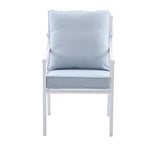The My Texas House Cambria Steel Outdoor Patio Dining Chair set includes two spacious armchairs crafted to elevate your outdoor gatherings with comfort and style. Each chair features a durable powder-coated steel frame that resists rust and maintains its white finish through changing weather conditions. The seat and back cushions are made from Scotchgard-treated recycled polyester fabric, offering resistance to stains and fading while providing plush support with foam fill. Designed with wider Velcro straps, the cushions stay securely in place for added convenience. These chairs support up to 300 pounds each, ensuring sturdy seating for guests. Their stackable design allows for easy storage when not in use, saving space on your patio or deck. The versatile coastal to contemporary aesthetic blends seamlessly with various outdoor furniture styles, making this set a perfect addition to your outdoor dining area. Assembly is required and recommended for two people, ensuring a straightforward setup process. Maintain the chairs by wiping them with a soft, dry cloth and storing them in a cool, dry place away from direct sunlight when not in use to prolong their lifespan.
