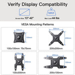 - Wide Compatibility: Fits 13-42 inch flat panel TVs and monitors with mounting hole patterns of 75x75mm, 100x100mm, 100x200mm, 200x100mm, and 200x200mm, supporting up to 44 lbs.