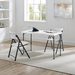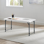 This Mainstays 4 Foot Adjustable Height Folding Plastic Table is crafted for versatility and durability, perfect for multiple settings including home, office, and outdoor events. The table adjusts to four different heights—22", 24", 29", and 34"—allowing you to customize it to your specific needs. Its fold-in-half design with an auto-locking center system ensures quick setup and compact storage. Constructed from UV-protected high-density polyethylene resin and supported by gray powder-coated steel oval legs, the table resists scratches and stains while providing robust stability. The ergonomic pinch-free push-button mechanism enables easy folding and unfolding of legs without hassle. Additionally, durable caps on the legs protect floors from damage. No assembly is required; the table can be opened or folded within seconds. With a weight capacity of 170 lbs and seating for four adults, this lightweight yet sturdy table is an excellent choice for versatile use indoors or outdoors.