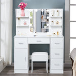 Transform your beauty routine with the Yamissi Makeup Vanity Set. This modern dressing table features a high-definition mirror equipped with 10 adjustable LED bulbs that offer three light modes: warm yellow, warm white, and cold white. This ensures you can accurately illuminate your skin tone and complexion at any time of day or night. The vanity desk is designed for optimal organization with 5 spacious drawers and 6 side shelves, providing ample room for all your cosmetics, jewelry, and beauty essentials. Crafted from durable MDF board in a brilliant white finish, this vanity is both strong and stylish, making it a perfect fit for any room decor. The overall dimensions of the vanity are 39.4 x 15.7 x 55.2 inches, while the included stool measures 14.2 x 9.5 x 15.7 inches for comfortable seating. Assembly is required, and the package includes the dressing table, vanity chair, 10 LED light bulbs, and an instruction manual for easy setup.