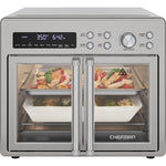 Experience the ultimate kitchen versatility with the Chefman French Door 10-in-1 Toaster Oven Air Fryer. This countertop appliance combines ten essential cooking functions—air fry, toast, bake, broil, roast, proof, reheat, keep warm, slow cook, and dehydrate—into one compact unit. Equipped with a powerful convection fan, it circulates hot air evenly to deliver crispy and evenly cooked meals faster than traditional ovens. The spacious 26-quart interior accommodates a 12-inch pizza or a whole 4-pound chicken, perfect for family-sized portions. The innovative French door design opens wide for easy food access and prevents heat loss during cooking. Intuitive dial controls allow precise selection of cooking mode, time, and temperature up to 450°F for customized meal preparation. Crafted with a durable stainless steel finish that resists stains and damage, this oven includes an air fry basket, flat wire rack, bake/broil pan, and removable crumb tray for effortless cleaning. The built-in viewing window with interior light lets you monitor your food as it cooks to perfection. Whether you're roasting vegetables or air frying crispy snacks, this all-in-one appliance streamlines your cooking process while delivering delicious results every time.