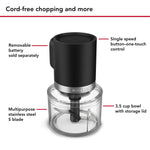 Experience versatile food preparation with the KitchenAid Go Cordless Top Down Chopper. Designed for portability and performance, this cordless chopper is powered by a rechargeable 12V MAX removable battery (sold separately), providing up to approximately 24 minutes of continuous run time. The 3.5 cup capacity bowl is ideal for everyday chopping, mixing, and pureeing tasks such as vegetables, herbs, nuts, and sauces. Equipped with a multipurpose stainless steel S-blade, it delivers consistent results across various ingredients. The one-touch control offers flexible operation: press and hold for continuous running or pulse for precise texture control. Its top-down design allows easy movement around the kitchen without cord restrictions. The included storage lid lets you chop, prep, and store in the same bowl, reducing dishes and streamlining cleanup. Setup is simple with a twist-free drop-in bowl assembly. This chopper combines convenience and performance to enhance your kitchen prep experience.