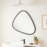 Signature Hardware 953827 Platt 33-1/4" W x 30-3/4" H Modern Geometric Framed Bathroom Wall Mirror For a minimalist yet unique accent piece, the Platt Asymmetrical Decorative Vanity Mirror is a perfect choice. The triangular shape features rounded corners for a softened look, while the iron frame promises lasting durability. Choose from multiple stunning finishes to match your decor style.