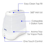 - ONE GALLON TANK: Operates for up to 20 hours and humidification coverage spans up to 500 sq. ft.