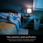 The Shark Air Purifier uses Pure Air Microforce to deliver fast, powerful, and quiet purification. Clean Sense IQ senses air quality and auto-adjusts to maintain clean air in your home, while reporting results in real time. A HEPA filter captures 99.98% of airborne particles like allergens, dust, and dander (based on IEST-RP-CC007.3, 0.1-0.2 microns). Cleans up to 1000 square feet, based on 1 air change per hour. Perfect for large bedrooms, kitchens, living rooms, and more. "Allergens" refers to non-living matter.