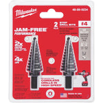Jam-free performance, dual-flute design provides greater speed and control. Optimized for cordless drills in high speed. Rapid Strike tip creates fast, accurate starts and generates less heat for up to 4X longer bit life. Optimized geometry with black oxide coating to cut faster and produce less heat. Laser engraved reference marks can easily be seen while drilling. 3-flat Secure-Grip shank ensures solid connection with the drill chuck to reduce slippage. No. 48-89-9201: Minimum Size: 1/8 In., Maximum Size: 1/2 In., Step Range: 1/32 In., Number of Holes: 13 Sizes, Shank: 1/4 In. 3-Flat, Material: High Speed Steel, Black Oxide, Pkg Qty: 1, Package Type: Card No. 48-89-9202: Minimum Size: 3/16 In., Maximum Size: 1/2 In., Step Range: 1/16 In., Number of Holes: 6 Sizes, Shank: 1/4 In. 3-Flat, Material: High Speed Steel, Black Oxide, Pkg Qty: 1, Package Type: Card No. 48-89-9203: Minimum Size: 1/4 In., Maximum Size: 3/4 In., Step Range: 1/16 In., Number of Holes: 9 Sizes, Shank: 3/8 In. 3-Flat, Material: High Speed Steel, Black Oxide, Pkg Qty: 1, Package Type: Card No. 48-89-9204: Minimum Size: 3/16 In., Maximum Size: 7/8 In., Step Range: 1/16 In., Number of Holes: 12 Sizes, Shank: 3/8 In. 3-Flat, Material: High Speed Steel, Black Oxide, Pkg Qty: 1, Package Type: Card No. 48-89-9234: Minimum Size: 3/16 In., Maximum Size: 7/8 In., Step Range: 1/16 In., Number of Holes: 12 Sizes, Shank: 3/8 In. 3-Flat, Material: High Speed Steel, Black Oxide, Pkg Qty: 2, Package Type: Clamshell No. 48-89-9205: Minimum Size: 1/4 In., Maximum Size: 1-3/8 In., Step Range: 1/8 In., Number of Holes: 10 Sizes, Shank: 3/8 In. 3-Flat, Material: High Speed Steel, Black Oxide, Pkg Qty: 1, Package Type: Card No. 48-89-9206: Minimum Size: 3/8 In., Maximum Size: 1/2 In., Step Range: 1/16 In., Number of Holes: 2 Sizes, Shank: 1/4 In. 3-Flat, Material: High Speed Steel, Black Oxide, Pkg Qty: 1, Package Type: Clamshell No. 48-89-9207: Minimum Size: 7/8 In., Maximum Size: 1 In., Step Range: N/A, Number of Holes: 1 Size, Shank: 3/8 In. 3-Flat, Material: High Speed Steel, Black Oxide, Pkg Qty: 1, Package Type: Card No. 48-89-9208: Minimum Size: 1/2 In., Maximum Size: 1 In., Step Range: 1/16 In., Number of Holes: 9 Sizes, Shank: 3/8 In. 3-Flat, Material: High Speed Steel, Black Oxide, Pkg Qty: 1, Package Type: Card No. 48-89-9209: Minimum Size: 7/8 In., Maximum Size: 1-1/8 In., Step Range: N/A, Number of Holes: 2 Sizes, Shank: 3/8 In. 3-Flat, Material: High Speed Steel, Black Oxide, Pkg Qty: 1, Package Type: Card No. 48-89-9212: Minimum Size: 7/8 In., Maximum Size: 1-3/8 In., Step Range: N/A, Number of Holes: 5 Sizes, Shank: 3/8 In. 3-Flat, Material: High Speed Steel, Black Oxide, Pkg Qty: 1, Package Type: Card