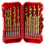 The Milwaukee SHOCKWAVE Impact Duty 25-Piece Metric Titanium Drill Bit Kit is designed to deliver superior durability and efficiency for professional and DIY users alike. Each drill bit features a titanium coating that significantly extends lifespan compared to standard black oxide bits. The innovative QUAD EDGE tip provides a precision start with four cutting edges, reducing walking and enabling faster, more accurate holes. The variable helix flute begins with an aggressive 35-degree angle tapering to 15 degrees, promoting rapid chip removal to reduce heat buildup and prolong bit sharpness. An internal thicker tapered web enhances strength, minimizing premature breakage during demanding tasks. Suitable for drilling into metal, wood, and plastics, these bits are compatible with both drills and impact drivers. The set comes in a customizable accessory case designed for easy organization and portability, making it an essential addition to any tool collection.