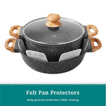 - Just use the included felt protectors that go between each piece to help keep them safe from scuffs and scratches while in storage. Be sure to use the utensils and their rest while you're cooking too.