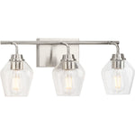 The Avec Adalyn 3-Light Vanity Light combines elegant design with functional lighting to enhance bathroom and powder room spaces. Its brushed gold frame complements the softened diamond silhouette of the clear glass shades, delivering bright white illumination that suits modern farmhouse and craftsman decor styles. The fixture allows versatile installation with the option to mount the glass shades facing either up or down, providing customizable lighting to fit your needs. Compatible with dimmable incandescent bulbs up to 60 watts each, this wall-mounted light fixture supports dimmer switches (sold separately) for adjustable ambiance. Constructed with durable steel housing and clear glass shades, it is cULus damp location listed, ensuring safe operation in moisture-prone areas. This vanity light measures 22.25 inches wide, 9.25 inches high, and extends 7 inches from the wall, making it a stylish and practical addition to your bathroom lighting setup.