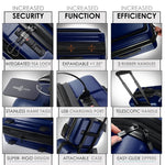 The StorageBud 4 Piece Hardshell Expandable Luggage Set is designed for the modern traveler. This stylish navy blue luggage set features a hard shell with a padded front pocket and an integrated USB port for charging devices on the go. With its expandable feature, roomy interior, and large zippered compartments, packing is made easy. The set includes a cosmetic case for personal items, and the gel spinner wheels ensure smooth maneuverability. Perfect for airplane travel, this luggage set meets all airline requirements and offers impact resistance for durability.