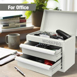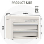 The WORKPRO Mini Metal Tool Box combines durability, practicality, and style in a compact design ideal for organizing tools and various small items. Constructed from premium cold rolled steel, this toolbox ensures long-lasting strength while maintaining a lightweight profile for easy portability. It features two spacious drawers and a top compartment, each equipped with PVC liners that prevent tools from rolling around and minimize noise during use. Magnetic tabs behind each drawer provide secure closure to prevent accidental sliding, enhancing safety during transport or storage. The toolbox rests on four PP feet pads that protect surfaces from scratches and preserve the paint finish. With a total load capacity of 26 lbs and individual drawer capacity of 8.7 lbs, it accommodates a variety of tools and accessories efficiently. Its eye-catching macaron color not only brightens your workspace but also promotes a relaxed atmosphere. Beyond tool storage, this versatile box is perfect for organizing school supplies, office essentials, cosmetics, jewelry, and other daily items, making it a multifunctional addition to any home or workshop environment.