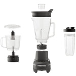 1.50 Oz. Boron glass blending jar: accommodates large blending needs. 20 Oz. Jar: Single serve size with travel lid. 4 Cup chopper attachment: includes stainless steel blade. Stainless steel attachment: Durable and easy to clean. Digital touch panel sensor: Display lights up when ready for use.