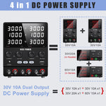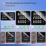 • 4-in-1 Versatile Power Modes: Switch easily between two independent 30V 10A outputs, a combined 60V 10A series output, or a parallel 30V 20A output to meet diverse power needs without manual rewiring.