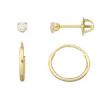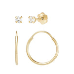 The Brilliance Fine Jewelry Girls Cubic Zirconia Studs and 12MM Endless Hoop Earrings Set in 10K Yellow Gold combines timeless style with quality craftsmanship. Each piece is meticulously created from polished 10K yellow gold, offering a warm and classic look that complements various styles. The set includes round cubic zirconia stud earrings featuring 3mm stones securely prong-set to maximize brilliance and shine. The matching 12mm hoop earrings feature an endless design that provides a comfortable and flexible fit, enhanced by a prong-set round white cubic zirconia stone at the center for added sparkle. The hollow construction of the hoops ensures lightweight comfort for all-day wear. Stud earrings come with secure safety screw backs to keep them safely in place. This versatile set is perfect for layering with other jewelry or wearing alone for a simple yet elegant touch. Its durable gold finish ensures long-lasting wear, making it an excellent choice for gifting or personal collection.