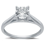 Timeless romance, unmatched brilliance celebrate your love with the Forever Bride Women's 10K White Gold Solitaire Engagement Ring, 1/2 CTTW Round Diamond (I2, H-I), a masterpiece designed to capture the essence of enduring commitment. Expertly crafted for elegance and durability, this ring features a stunning 0.50 CTTW round diamonds (I2 clarity, H-I color) showcased in a classic solitaire design in 10 karat white gold. The center stone is securely held by four prongs and a unique miracle plate setting, enhancing its sparkle while ensuring lasting stability. Nestled within the ring gallery, two hidden diamonds are artfully set in sleek bezels, adding a touch of sparkle to every angle.