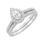 This sparkling halo setting showcases a stunning diamond-encrusted bridal ring with delicate wedding band beautifully complementing the engagement ring with micro-pave diamond accents that extends halfway around the ring.This classic halo diamond ring is designed with lab grown pear center diamond of 0.38 ctw crafted in 10kt white gold beautifully held in a four prong claw setting. As elegant as it is timeless, this beautiful diamond ring will be adorned and truly treasured forever.