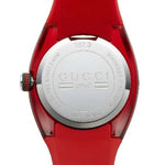 Gucci YA137303 Women's Watch Sync Quartz Date Display Red Dial Rubber Strap This tough luxury watch is part of Gucci's Sync collection. This model YA137303 has a 36mm stainless-steel and red transparent nylon case with silver PVD bezel. The red sun-brushed dial is accented with matte interlocking G, transparent silver hands, date at 3 o'clock, Gucci logo at 12 o'clock and Swiss made at 6 o'clock. The red rubber strap features Gucci's iconic green and red Web detail through the center, is adjustable from 161mm to 200mm using the stainless steel ardillon buckle. A precision Swiss quartz movement powers the timepiece keeping accurate to the second. The dial is protected by domed scratch resistant sapphire crystal.Green and red Web detail and interlocking G are displayed on the silver stainless-steel crown. Timepiece is water resistant to 5ATM (50 meters/ 160 feet). Gucci Sync logo engraved on case back.