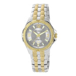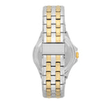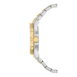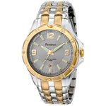 [Always be on time and style with this two-tone polished, 42mm round case men's watch by Armitron. Some of the features on this men's watch include the GILT UP Arabic 12, 3 and 9, luminous indexes at all other hours, the calendar window at the six o'clock hour and the one direction turning ratchet bezel in gold finish. The two-tone polished metal bracelet on this Armitron men's watch comes with a two button fold over buckle for secure fastening.]