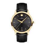 Movado 0607455 1881 Automatic Men's Watch This men's 1881 Automatic watch from Movado is distinguished by a 39mm gold-tone stainless steel case with an exhibition back, and a round bi-level black soleil dial with a gold-tone signature dot and hands, stamped stick-shaped hour markers with applied gold-tone accents, a stamped minute index, and a round date display. The black leather strap secures with a push-button deployment clasp while a scratch-resistant sapphire crystal tops the case. The watch features a Swiss automatic movement, and is water-resistant to 30 meters.