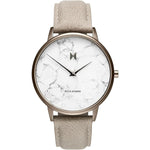 Cut from genuine marble, the Crescent Marble's unique 38mm white marble dial is the only one of its kind. Featuring a brushed taupe case and bone grey leather strap.