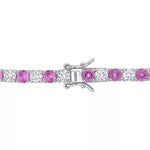 Adorn your wrist tastefully with this lab-created Pink Sapphire Tennis Bracelet in Sterling Silver, 7.25". The cushion-cut blue sapphires are arranged alternately with pairs of round white sapphires in a prong setting for an elegant finishing touch, instantly enhancing little black dresses, corporate attire or evening gowns.