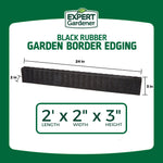 The Expert Gardener 2' x 3" Black Recycled Rubber Garden Border Landscape Edging is a versatile and eco-friendly solution for defining and beautifying your garden and landscape areas. Made entirely from recycled rubber, this edging is designed to withstand various weather conditions without cracking or deteriorating, ensuring durability year-round. Its flexible construction allows for easy installation along straight or curved lines, adapting perfectly to your landscaping needs. The SmartLocâ„¢ system features interconnecting pieces that create a smooth, continuous border while providing stability and strength. Each piece comes with a connector and two anchor spikes to secure the edging firmly in place without the need for digging. This product is perfect for enhancing flower beds, garden paths, sidewalks, driveways, and other outdoor spaces while promoting sustainability through the reuse of end-of-life tires. With its ripple pattern and black color, it offers an attractive yet subtle finish that complements various landscape designs.