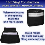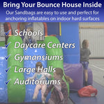 Moose Supply Vinyl Sand Bags provide a commercial-grade solution for safely anchoring inflatable bounce houses, water slides, tents, and other inflatables on various surfaces where staking is not feasible. Constructed from heavy-duty 18-ounce vinyl with double-stitched seams, these sandbags deliver exceptional durability to withstand frequent use in both indoor environments like schools, daycare centers, gymnasiums, auditoriums, and outdoor settings. Each sandbag measures 21" by 21" and can hold between 50 to 80 pounds of sand (sand sold separately), ensuring a stable base to prevent movement during use. The design includes sewn-in D-rings for secure tie-downs and attached rubber handles for easy carrying and positioning. The top opening features hook and loop fasteners that allow quick filling and emptying while maintaining a secure closure to protect the contents. These reusable sandbags offer a reliable alternative to cheaper options that may tear or leak, providing long-term value for rental companies and businesses requiring versatile anchoring solutions for inflatables and other equipment.