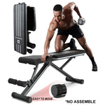 - No Installation and 90% Space Saving: No Assembly Required! Pooboo weight bench comes almost ready to use out of the box. Just unfold the bench and set a knob. It folds up easily and can stand on it’s own. Easy to move around. After a workout you can store in a corner, closet , or under a bed