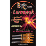 Never lose an arrow again! Replace your original internal mount nocks with the Lumenok Signature Lighted Nock. Lights up automatically when seated against a carbon or aluminum arrow shaft. Stays lit for up to 40 hours. No magnets, no glue, no switches or moving parts. Light can be disengaged by backing nock out of arrow shaft.