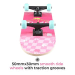 Roll out in style with the Barbie Pink Checkered Malibu Beach 31" Skateboard! Fresh off the success of the recent Barbie movie, this skateboard lets young fans bring the vibrant, glamorous world of Barbie to their local skatepark. This skateboard features a sturdy 31" x 7.5" maple deck adorned with a pink checkered design, an iconic Malibu beach scene, palm trees, and the stylish Barbie logo. The eye-catching design captures the spirit of Barbie while adding a touch of Californian beach chic. The 50x30mm wheels provide a smooth ride, while the lightweight composite pro trucks and ABEC 5 bearings offer excellent control and speed. The pro black grip tape ensures a secure and stable ride, making this skateboard perfect for beginners and fans of Barbie. Whether you're cruising the beach boardwalk or practicing tricks at the skatepark, the Barbie Pink Checkered Malibu Beach 31" Skateboard offers a fun, exciting way to enjoy the outdoors and show off your love for Barbie!