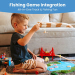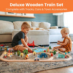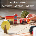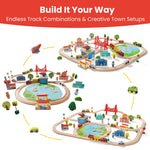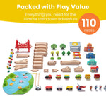 [Tiny Land 110PCS All-in-One Wooden Train Set: Perfect for Family & Party Time! Includes wooden train tracks building blocks and puzzles. Ideal for ages 3 to 8 it encourages teamwork and offers diverse play options. Features puzzles with a fishing theme complete with rods and magnetic fish. Create themed towns like a hospital or fire station with character accessories. Compatible with all major train brands. Safety certified: non-toxic BPA-safe and lead-safe.]