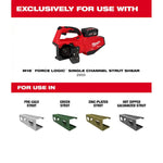 The MILWAUKEE Strut Shearing Dies are exclusively compatible with the MILWAUKEE M18 FORCELOGIC Single Channel Strut Shear. Milwaukee Tool Strut Shearing Dies deliver accurate and consistent cuts every time. These dies have two sharpened edges that achieve up to 10,000 shears per die set with no exposed blades. The laser etched die markings allow for easy identification and installation into the M18 FORCELOGIC Single Channel Strut Shear. Not for use in stainless steel.