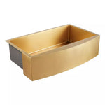 For those looking to add a striking focal point to their kitchen, the 33" Atlas Farmhouse Sink is the one. This item boasts a radiant, matte gold finish and an arched apron, each complementing one another perfectly. A large single well allows plenty of space for cleaning dishes and other chores.Its finish is applied through a PVD process that gives the bowl a complete, even coating that resists high temperatures and damage from falling objects. A scratch-resistant and liquid-repellent layer is applied to further protect its surface and allows blemishes to easily rub away. Made of 16-gauge, type 304 stainless steel, this basin is as durable as it is beautiful. Additional features include sound-absorbing pads and an undercoating that prevents the condensation to keep your cabinet dry. Match an optional drain with your choice of faucet to complete the look